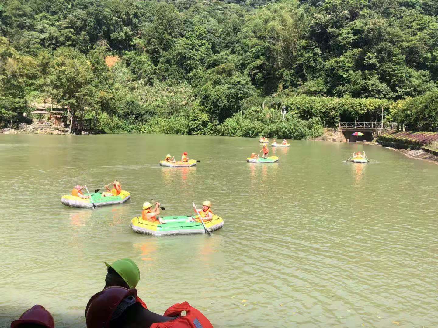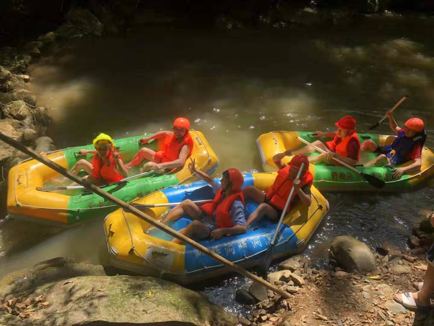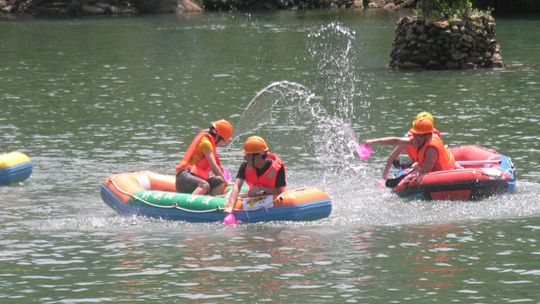 進了野趣溝,我們步行了一段路,放眼望去,滿目蔥翠,一條潺潺的小河從綠樹叢中流淌而出,聽導游講這就是我們將要漂流的那條河。大家都迫不及待了。抵達目的地我們換好泳衣,穿好了工作人員發(fā)的救生衣,登上了橡皮艇,驚險刺激的漂流就開始了。泛艇戲水,無法言語的刺激和釋放的感覺。各位同事時而泛舟奮力前行,時而駐足打起水仗,都沐浴在浪漫開心的山水之間!